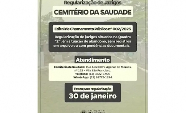 Vale do Ribeira - A Prefeitura de Registro-SP reforça a convocação para a regularização de jazigos do Cemitério da Saudade, conforme o Edital de Chamamento Público n° 002/2025, que trata dos jazigos localizados na Quadra "Z"