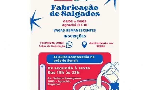 Quer aprender a fazer salgados e se qualificar? A Prefeitura de Registro-SP está com inscrições abertas para ○ curso gratuito, realizado diretamente no SENAI! Av. Saburo Kameyama, 1005 - Agrochá De 02/02 a 26/02 Segunda a sexta-feira 19h às 22h Curso 100% gratuito e exclusivo para moradores do bairro Agrochá lIl e ll Inscrições: (13) 99776-2983 Informações: Setor de Habitação Garanta sua vaga e invista no seu futuro Fonte: O Vale do Ribeira