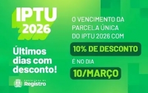 COTA ÚNICA DO IPTU 2026 EM REGISTRO VENCE EM 10 DE MARÇO A parcela única do IPTU 2026 em Registro vence no dia 10 de março. Contribuintes que optarem pelo pagamento à vista t... 26/02/2026/ 12:31:07