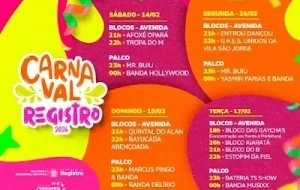 Registro-SP se prepara para quatro noites de Carnaval na Praça Beira Rio Registro-SP se prepara para viver o Carnaval 2026 entre OS fevereiro, na Praça Beira Rio mantendo o novo formato adot... 04/02/2026/ 12:50:09