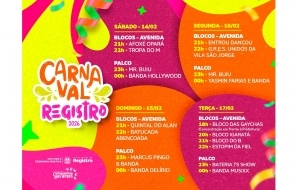 Registro se prepara para quatro noites de Carnaval na Praça Beira Rio Registro se prepara para viver o Carnaval 2026 entre os dias 14 e 17 de fevereiro, na Praça Beira Rio, mantendo o nov... 13/02/2026/ 13:47:27
