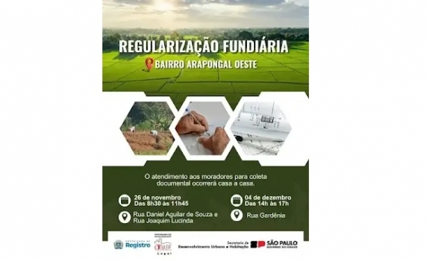 A Prefeitura de Registro, por meio da Secretaria Municipal de Negócio Juridicos e da Divisão de Habitação, em parceria com o Programa Cidade Legal do Governo do Estado, dará início à terceira etapa do Cadastro Social dos moradores do Arapongal Oeste. A ação integra ○ processo de Regularização Fundiária Urbana, que permitirá a emissão do título de propriedade aos ocupantes que atendam aos critérios legais.