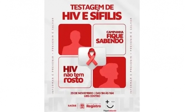 No dia 29 de novembro (sábado), das 9h às 16h, a Prefeitura de Registro- SP promove uma ação de testagem de HIV e Sifilis na UBS Centro.