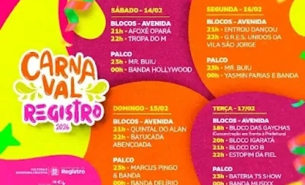 Registro-SP se prepara para viver o Carnaval 2026 entre OS fevereiro, na Praça Beira Rio mantendo o novo formato adotado na edição anterior, dias 14 e 17 de inspirado na organização das grandes cidades carnavalescas. Com planejamento e diversidade artística, a festa aposta em uma programação pensada para famílias e foliões de todas as idades.